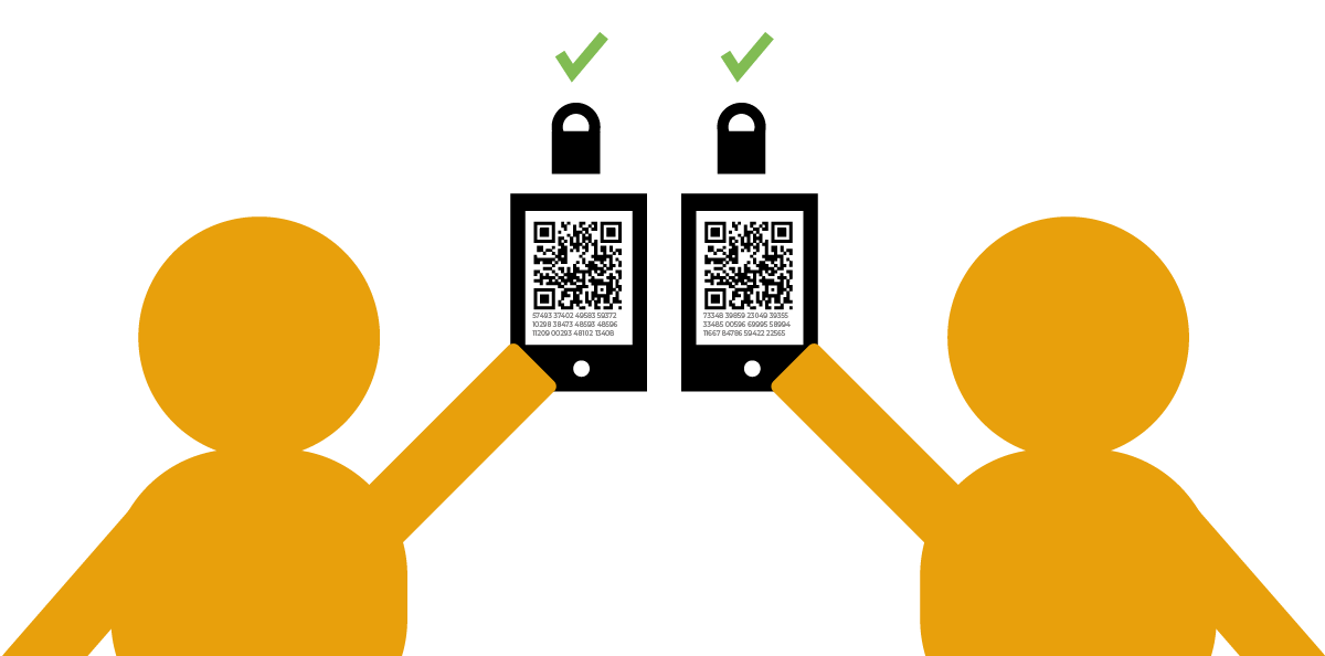 လူနှစ်ယောက်က QR code တွေနဲ့ ကိန်းစဉ်တွေ စာလုံးတွေပါတဲ့ စာတွဲကြီးတွေပေါ်နေတဲ့ ဖုန်းစခရင်နှစ်ခုကို ယှဉ်လျက်ကိုင်ထားပါတယ်။ တစ်ယောက်နဲ့တစ်ယောက် ဖုန်းကင်မရာသုံးပြီး အပြန်အလှန် QR code စကင်ဖတ်လို့ စကားဝှက်သော့ကို အတည်ပြုကြပါတယ်။ သော့ခလောက်တွေနဲ့ အစိမ်းရောင်အမှန်ခြစ်လေးက သူတို့ရဲ့ အတည်ပြုစစ်ဆေးမှု အောင်မြင်တာကို ရည်ညွှန်းပါတယ်။ |